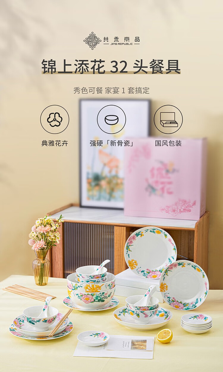 共禾京品 锦上添花高颜值餐具32头家用碗盘勺筷礼盒套装