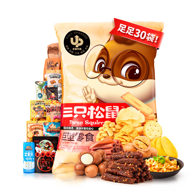 商品名称:三只松鼠 巨型零食大礼包30包 辣条肉脯儿童休闲零食 超6斤 单位:包