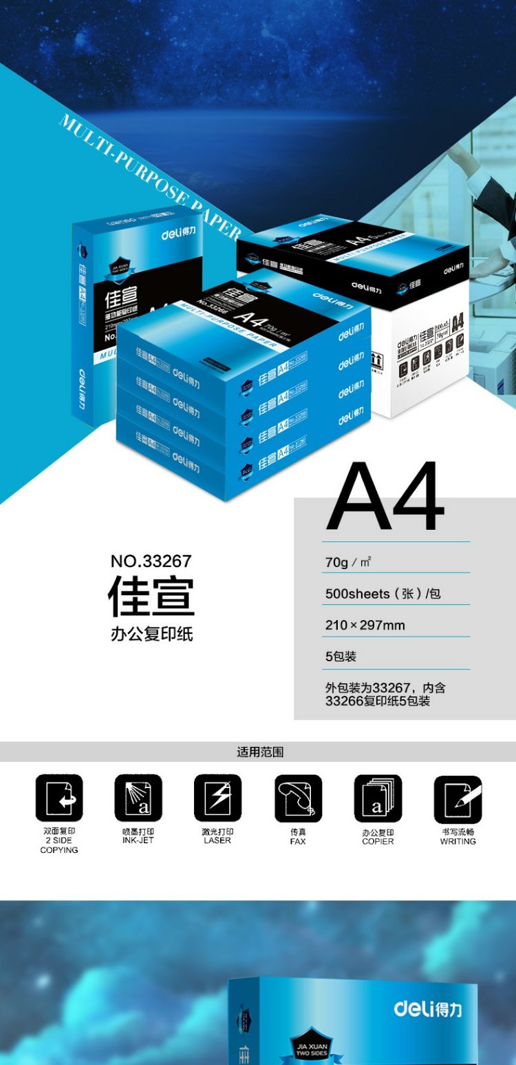 商品名称:得力 33267 佳宣A4白纸打印复印纸70g单包500张办公用纸80克a4复印纸