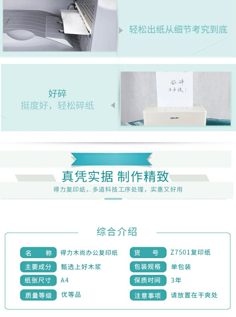 商品名称:得力 Z7501 木尚a4复印纸打印白纸铭锐80g办公用纸70g打印复印纸