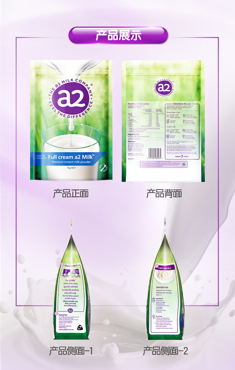商品名称:A2 高钙高蛋白速溶奶粉1kg/袋有效期至25年3月