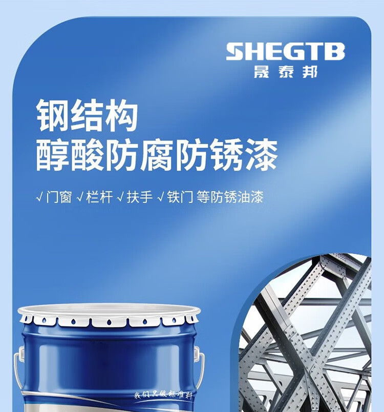 商品名称:晟泰邦 调和漆防锈漆金属漆设备漆钢构漆户外彩钢瓦栏杆铁门翻新油漆 2.5kg 单位:桶