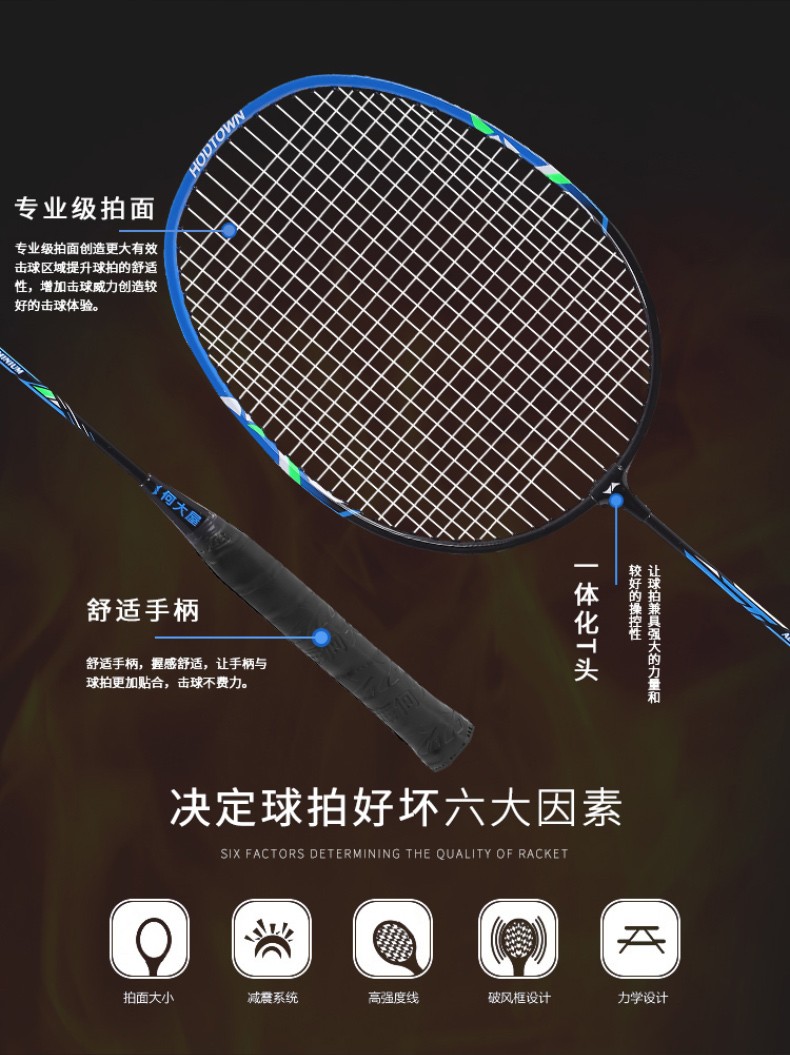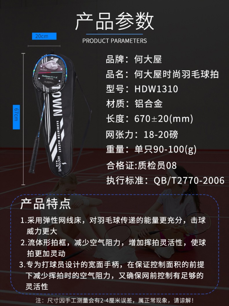 商品名称:何大屋(Hodtown) 羽毛球拍成人健身羽毛球拍羽毛球训练比赛耐打碳素羽拍初学者 时尚羽毛球拍HDW1310 单位:套