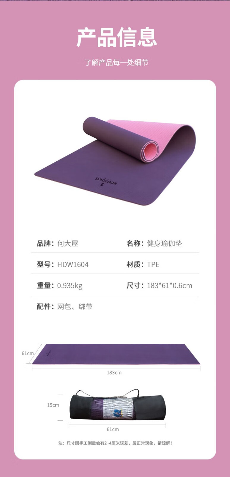 商品名称:何大屋(Hodtown)瑜伽垫加厚加宽加长183*60cm初学者健身垫男女防滑垫子家用加厚 HDW1604 单位:块