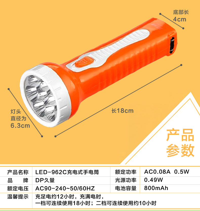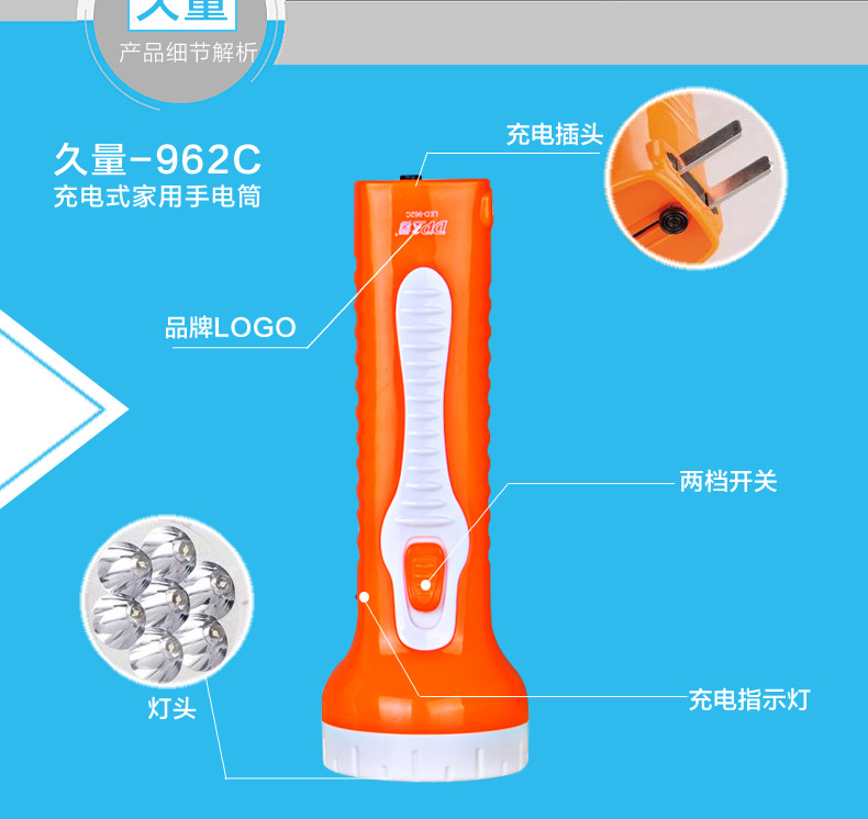 商品名称:久量/DP DP-962C 充电手电筒强光应急照明手电筒