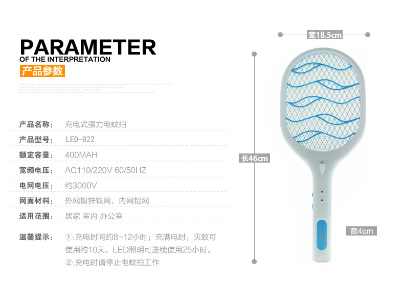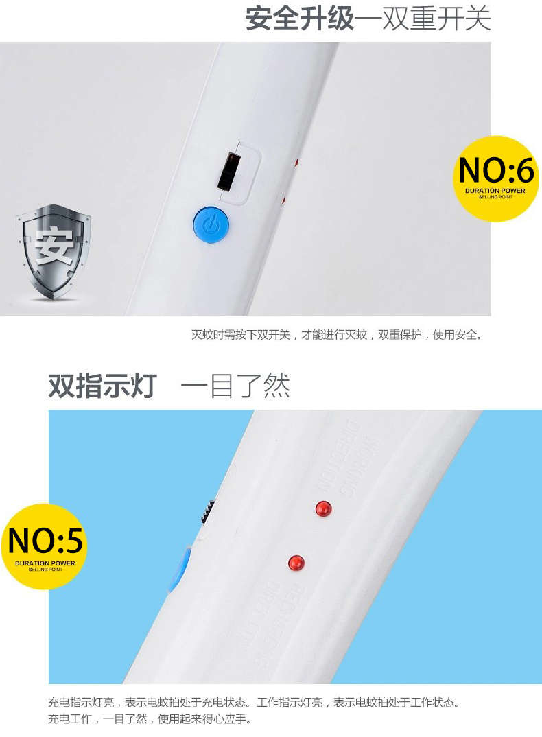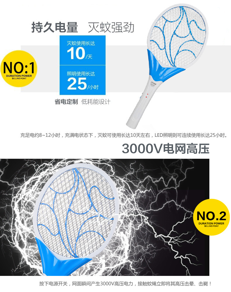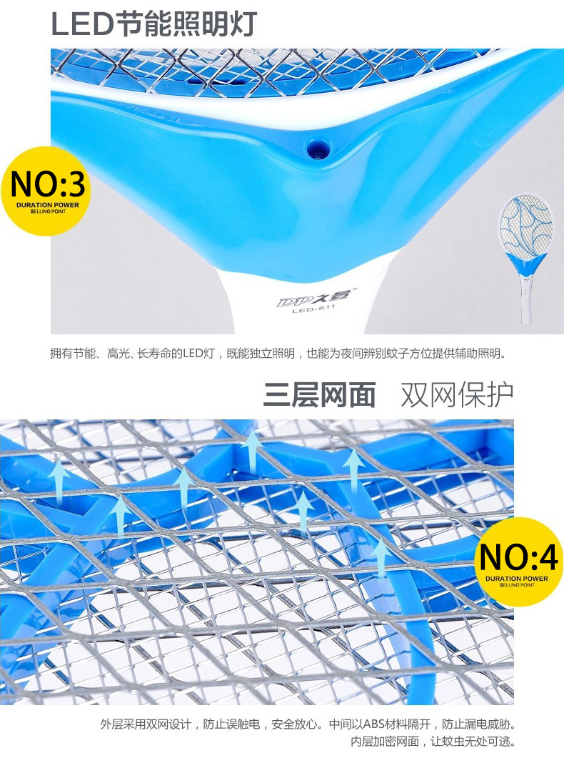 主要功能:灭蚊虫、可照明双功能。持久耐用:内置额定容量高达400mAh可充电池;可循环充电使用500次以上。节能照明:节能、高光、超长寿命的LED灯泡,既能独立照明,也能为夜间辨别蚊子方位提供辅助照明。