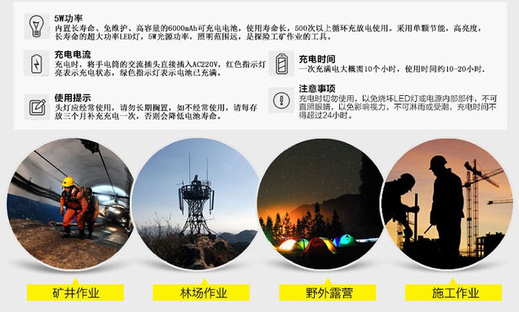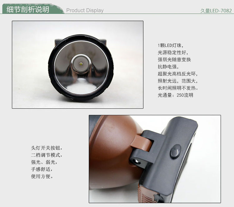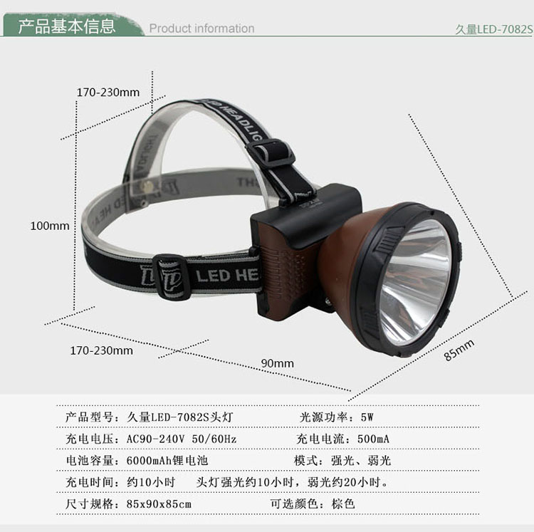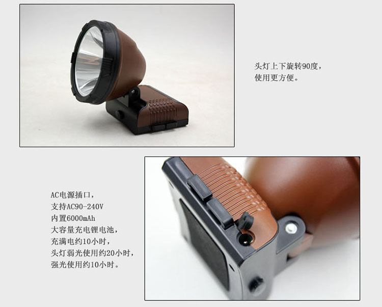 大功率单灯:采用大功率单颗节能、高亮度、长寿命的LED灯。松紧带设计:高弹性透气头带,可根据不同的头型进行松紧度的调节,适用性和舒适性高。卡伦调节设计:人性化卡伦调节设计,灯头0~90°自由转动,照明范围广,使用更方便灵活。强弱双档调节:按动开关至一档和二档时,可选强弱光的照明功能。