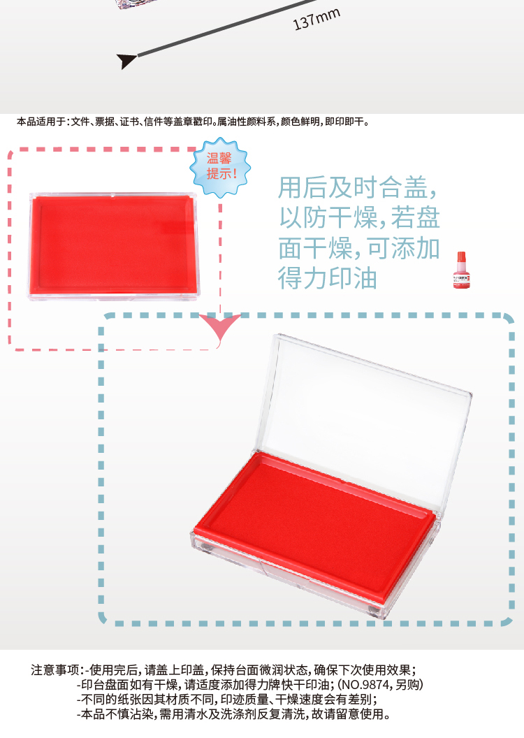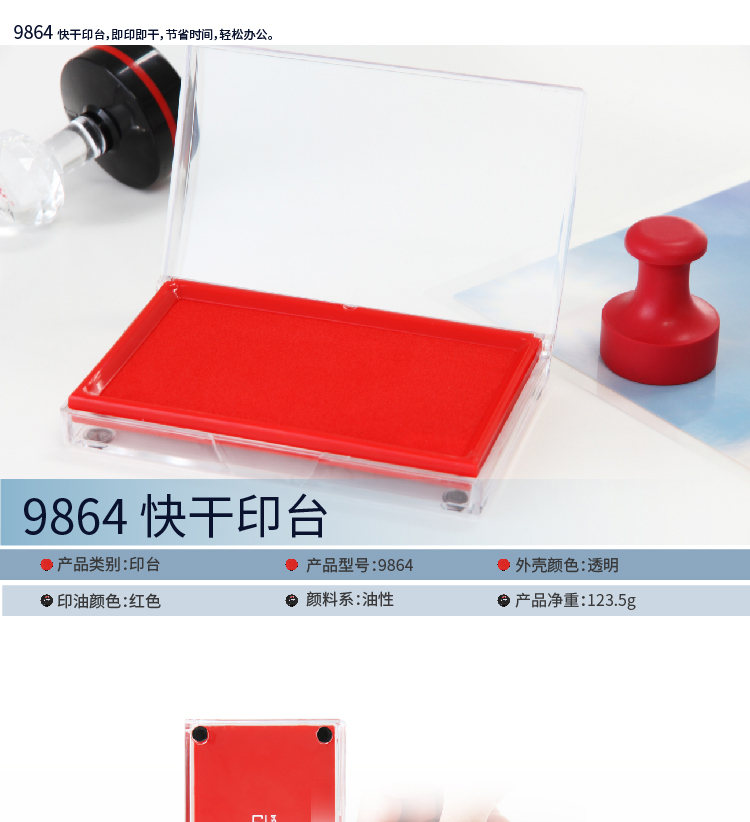 商品名称:得力 9864快干印台 方形透明外壳红色蓝色印油财务办公用品