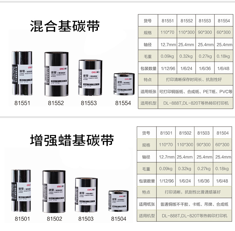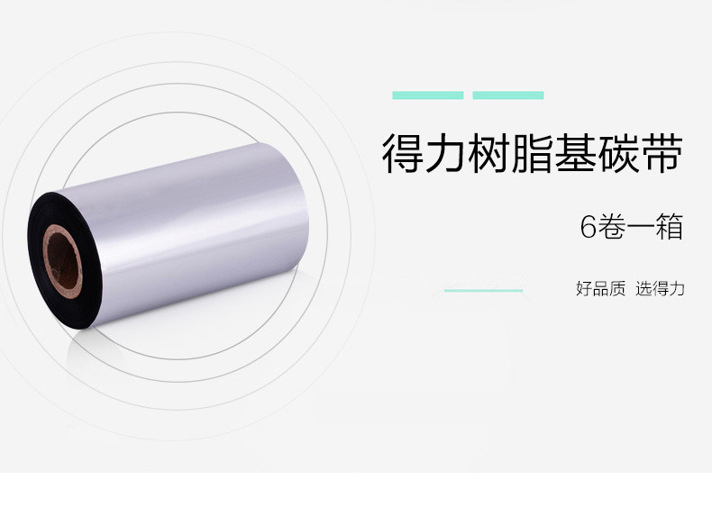 得力 81602 全树脂基碳带110mm*300m标签打印机耗材色带珠宝标签条码PET亚银纸PVC合成纸防刮不干胶打印碳带