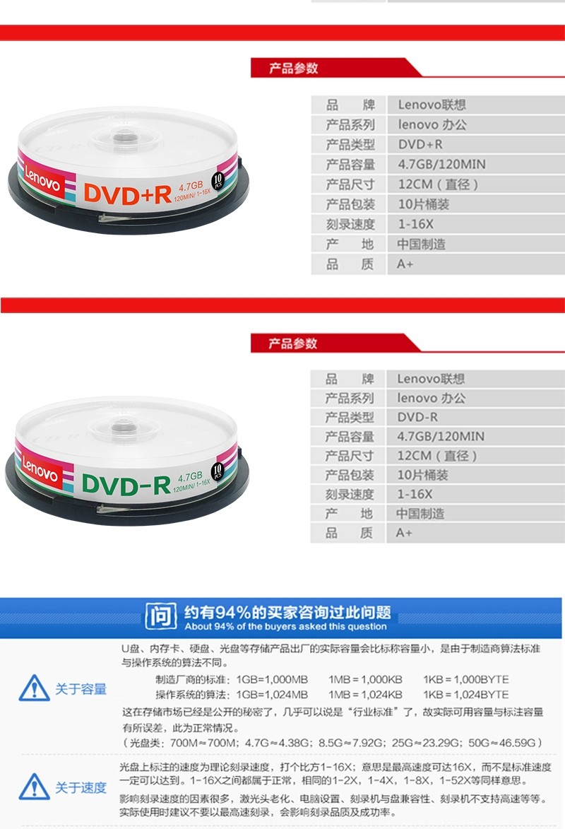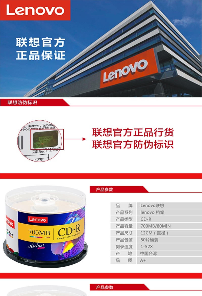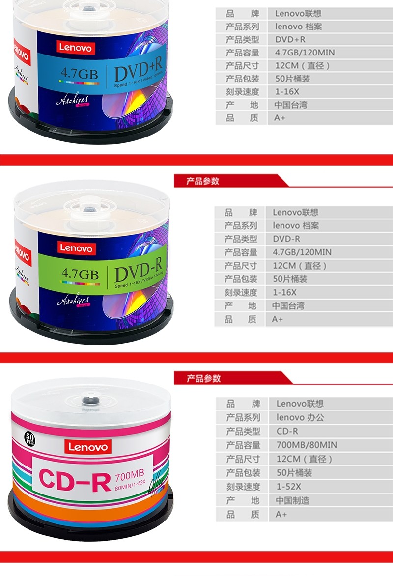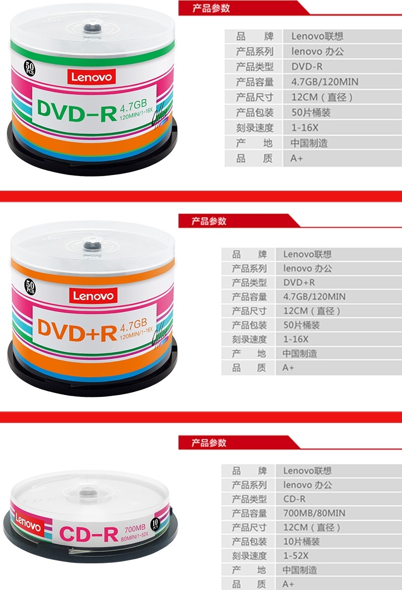 商品名称:联想(Lenovo) 空白光盘 DVD-R刻录光盘 DVD+R车载数据16X 4.7G CD-R 行业装 50片桶装 单位:桶