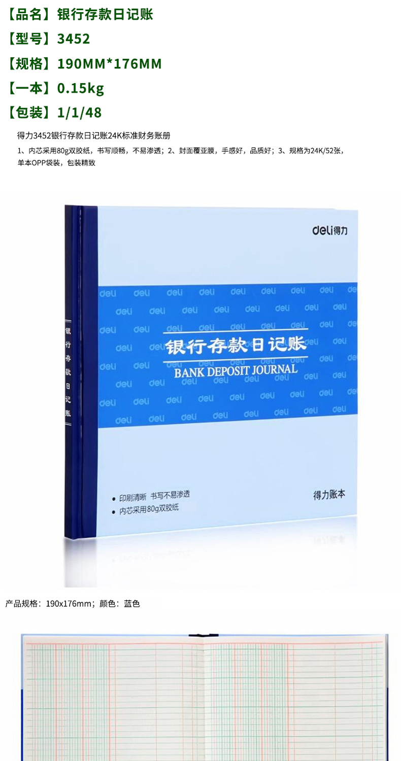 商品名称:得力 3452银行24k存款日记账本/账册财务办公 80g双胶纸100页