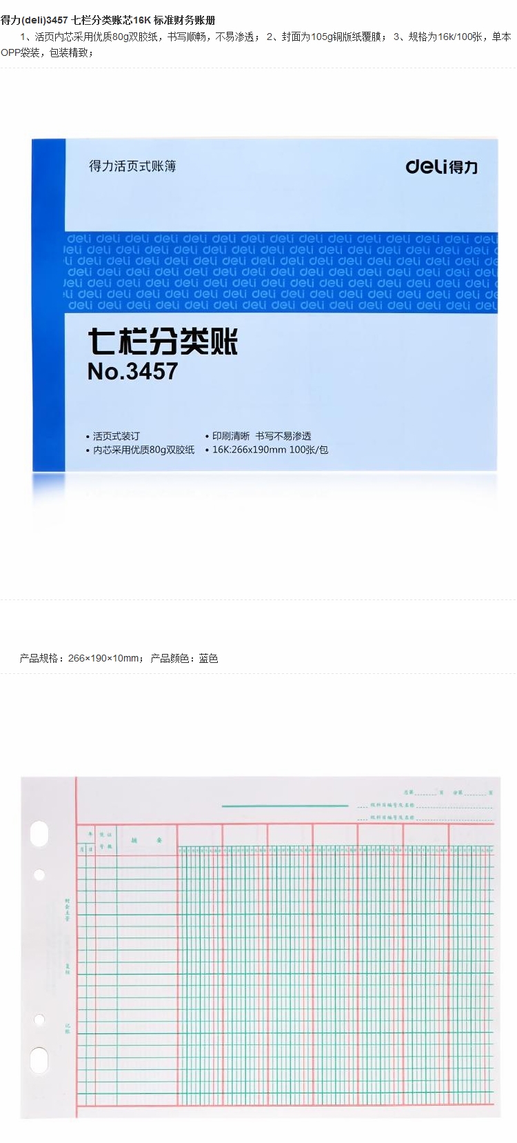 商品名称:得力 3457/16k七栏分类账100张活页式装订财务记账本账簿