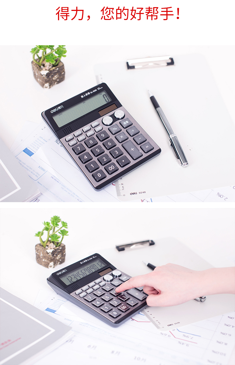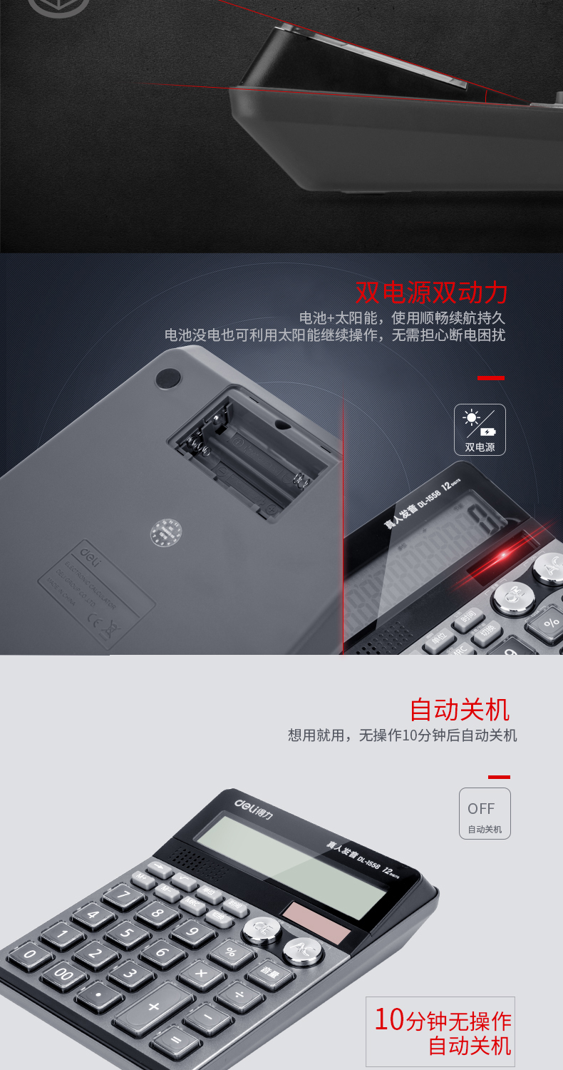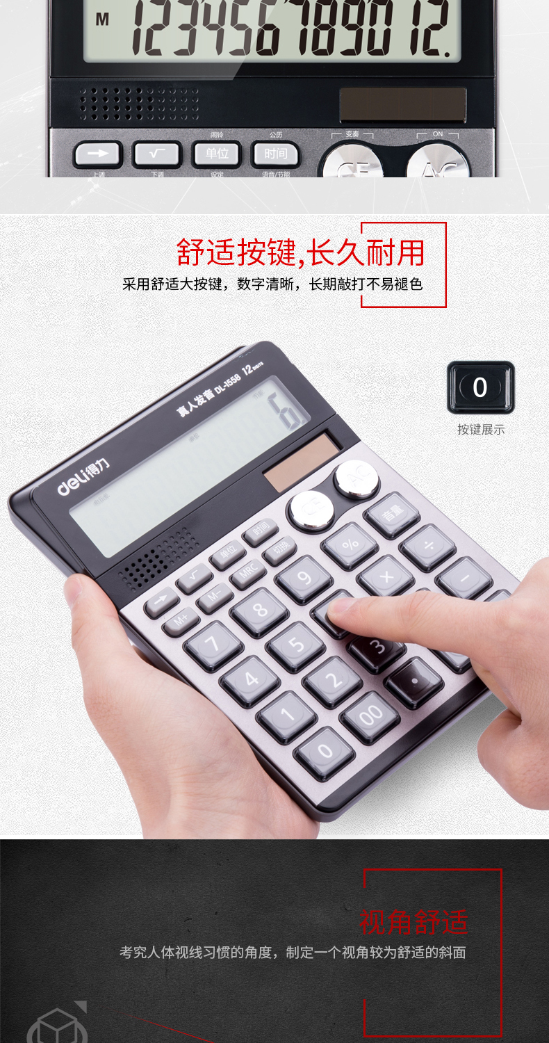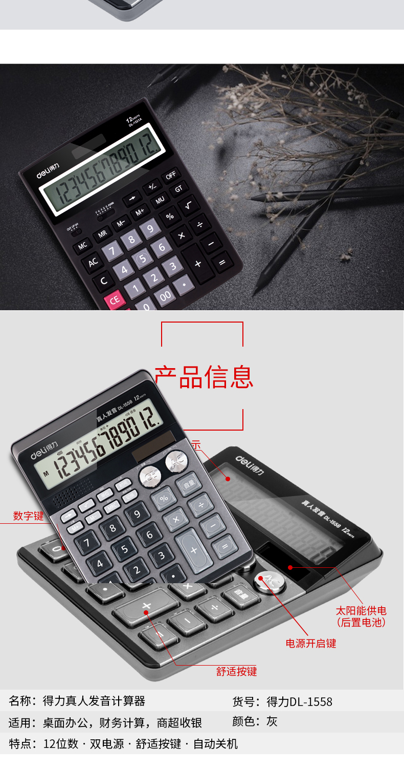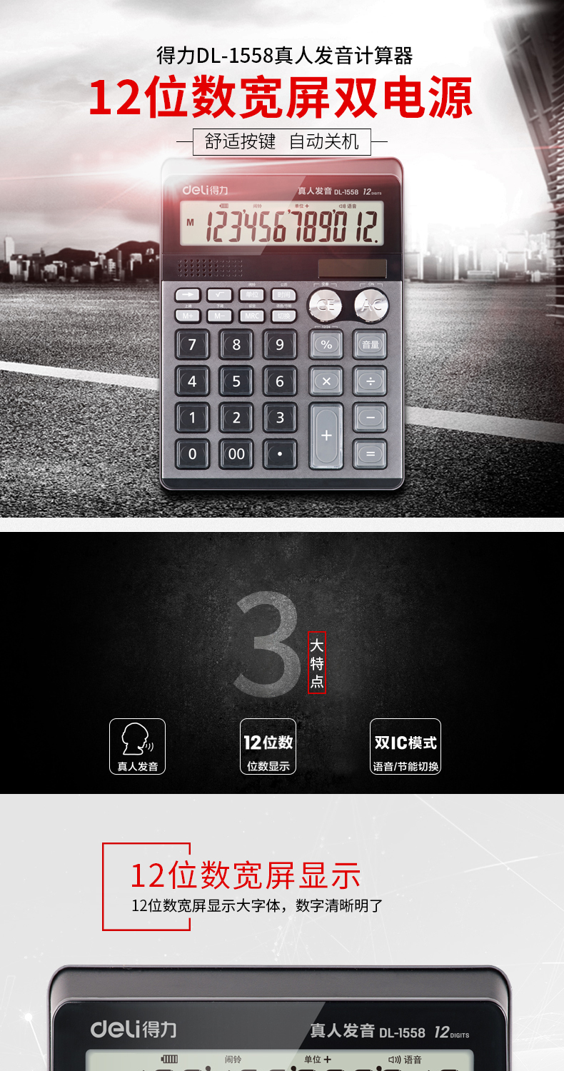商品名称:得力 1558 双电源语音计算器 太阳能语音计算机