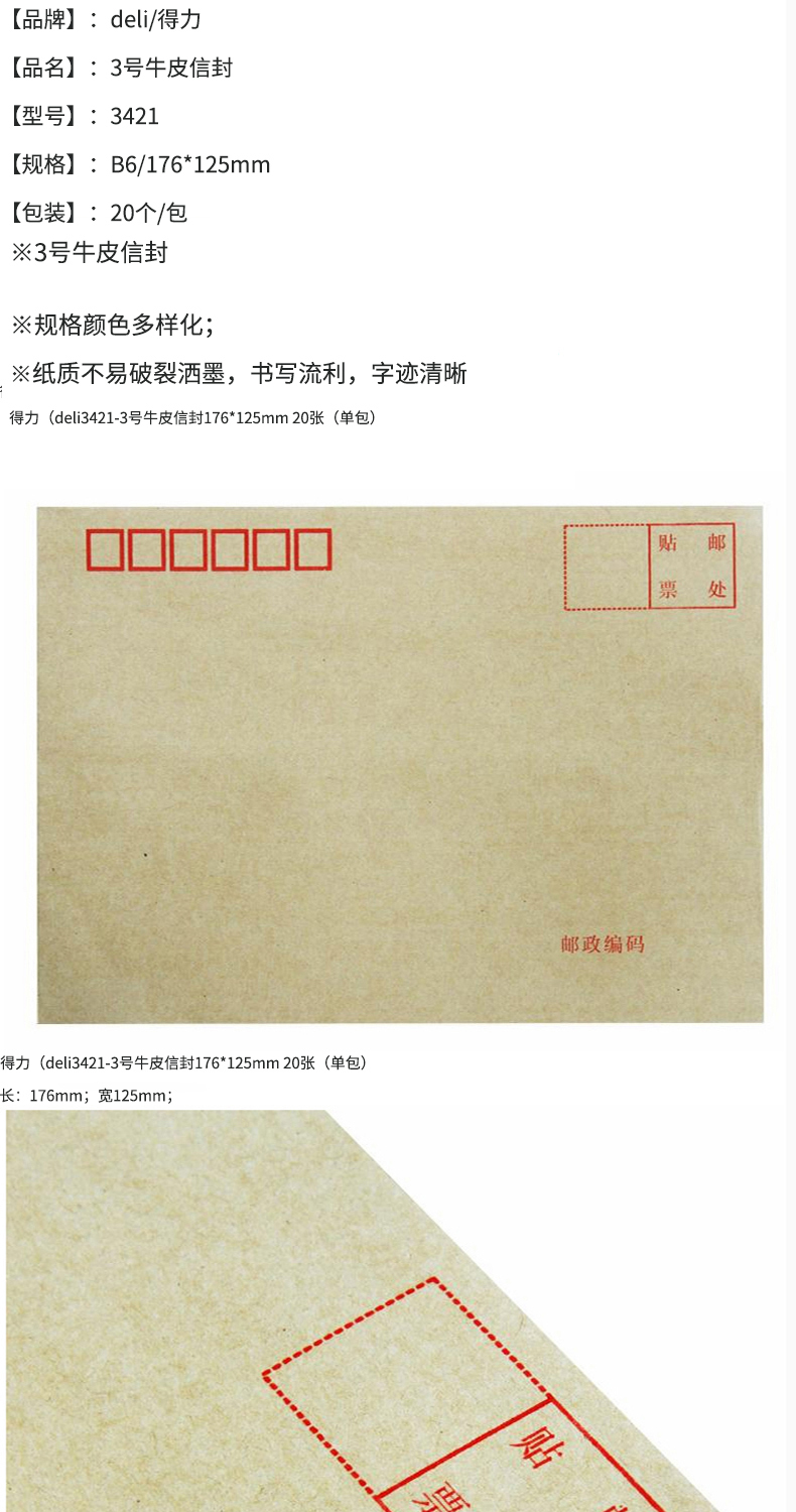 商品名称:得力 3420 3号白色信封 标准信笺优质纸质写字清晰20张(单包)