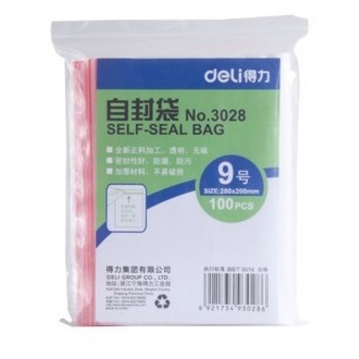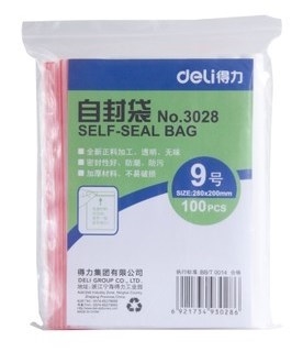 【名称】得力加厚自封袋 【编号】3028 【尺寸】9号(280*198mm) 【颜色】透明 【重量】约0.5kg/把/打包另计 【包装】100个/包,32包/箱 【价格】标价为100个/包 【特点】全新正料加工、透明、无味; 密封性好、防潮、防污; 加厚材料、不易破损。 【使用方法】优质PE料,凹凸扣,用手一捏,即可封口!