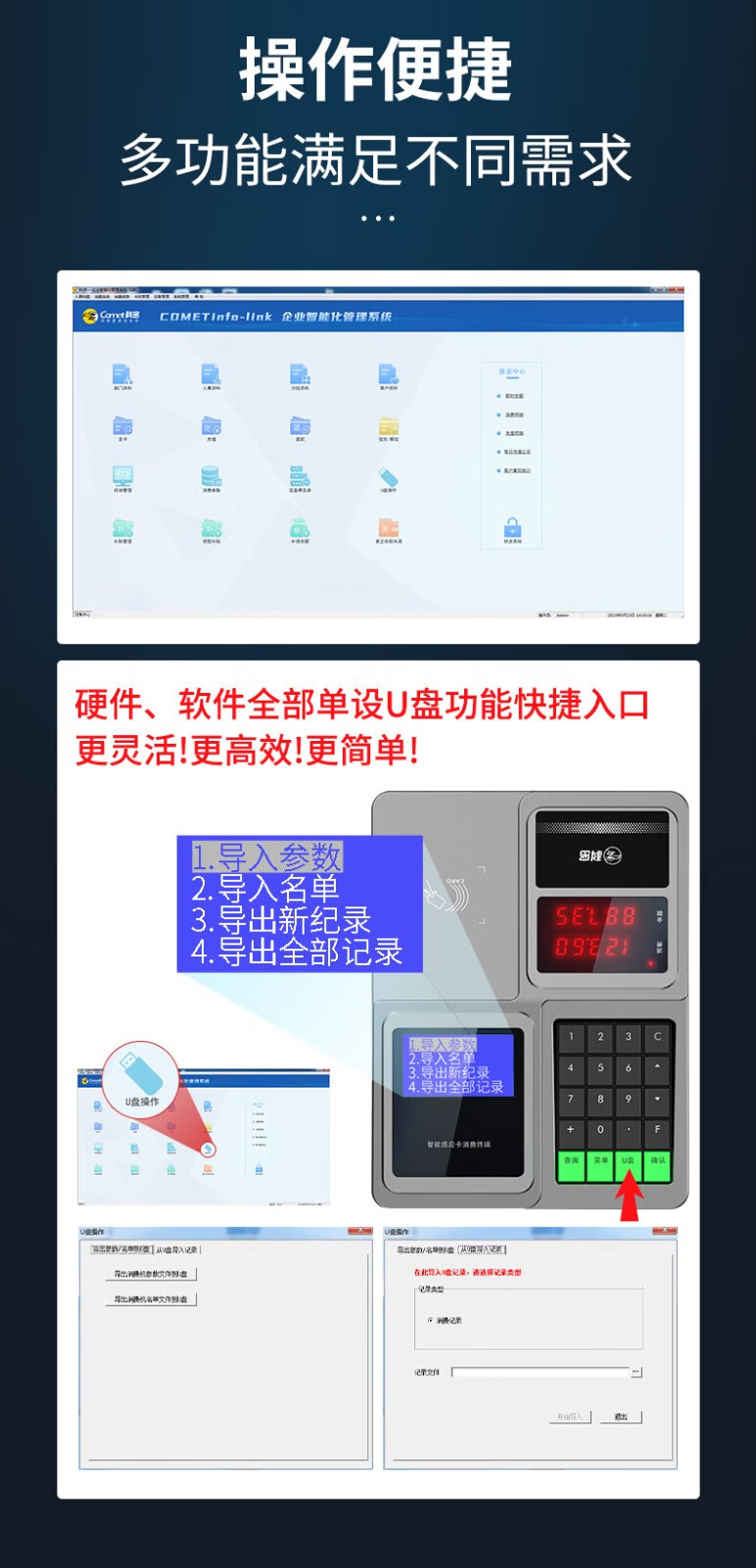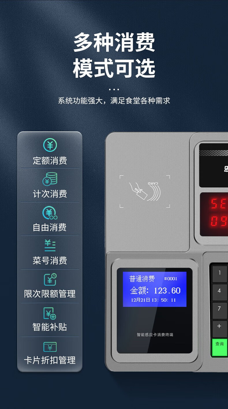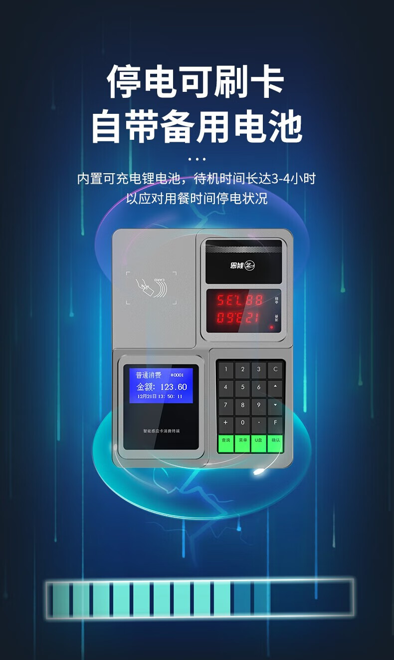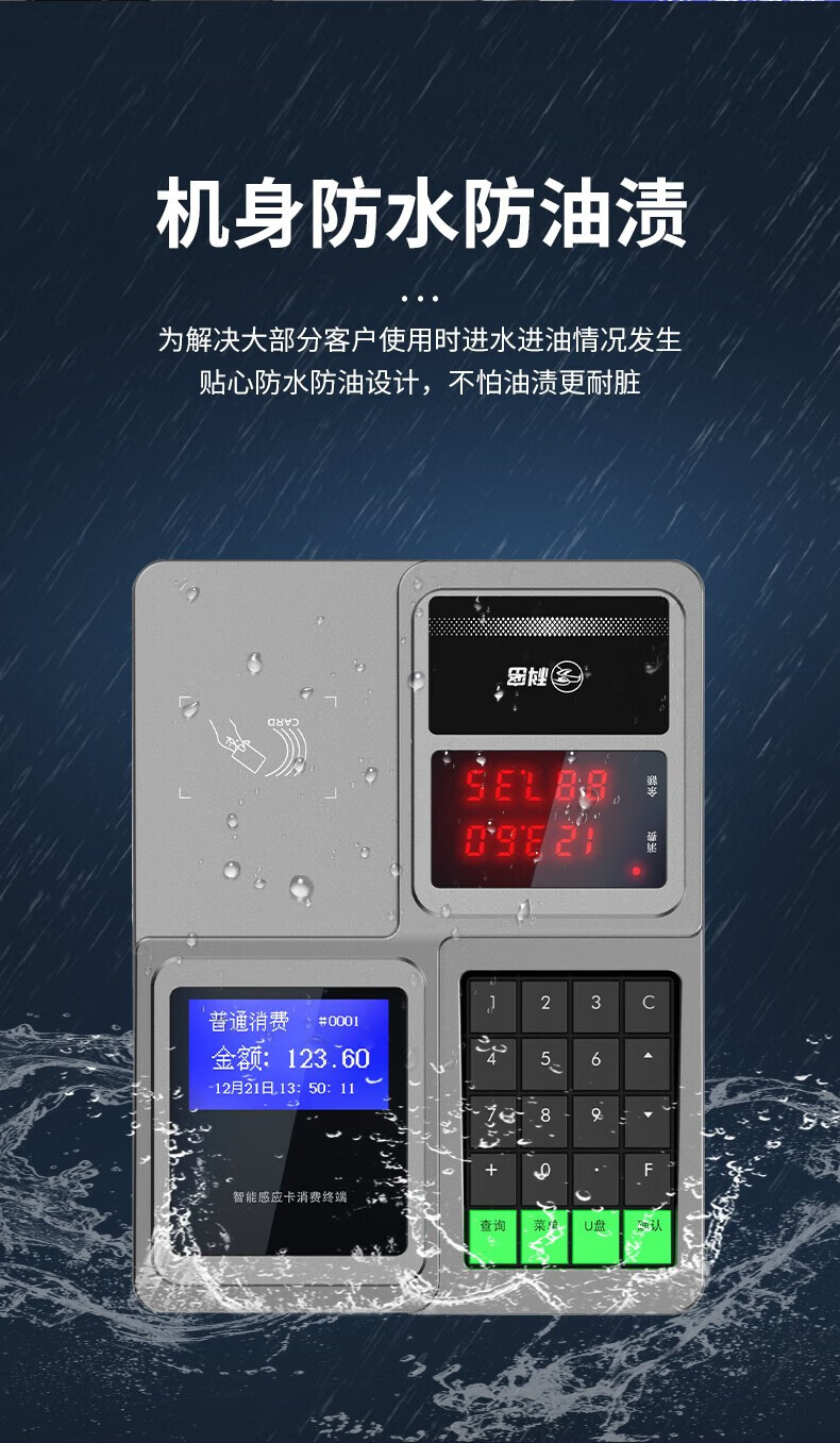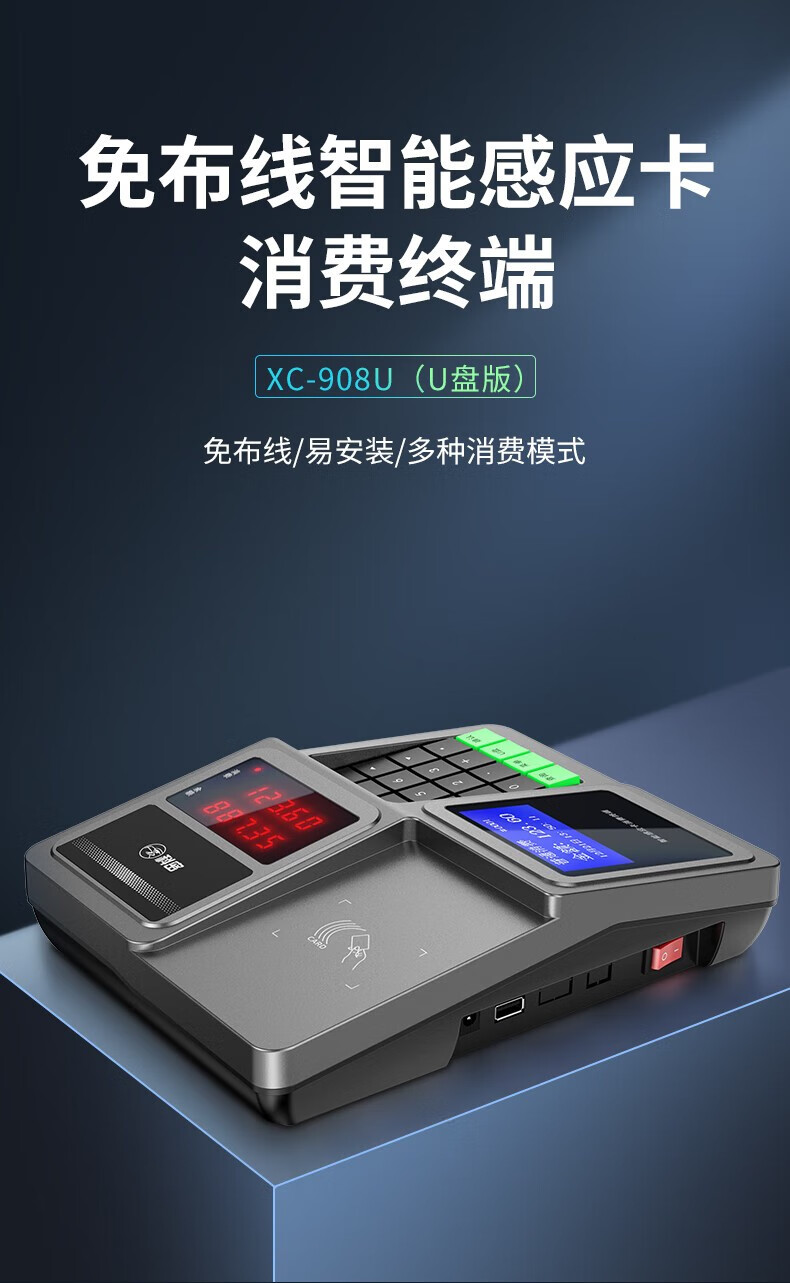 商品名称:科密XC-908U/XC80U消费机 食堂单位工厂学校餐厅刷卡饭卡机IC卡收费收银机U盘下载停电可用 科密XC908U标配+发卡器+100张饭卡 单位:台