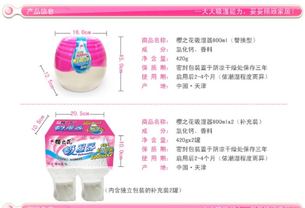 商品名称:樱之花 强力吸湿盒420克*3可吸湿2400ml大容量可替换吸湿桶干燥剂