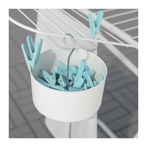 您可以把夹篮挂在干衣架或晾衣绳上,以腾出手来晾衣服。
