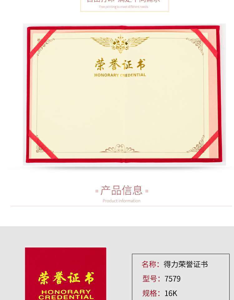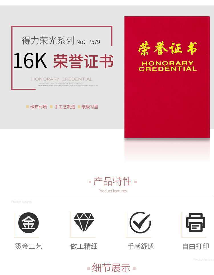 商品名称:得力 7579荣誉证书 皮革 16k得奖证书 烫金证书 奖彰证书 光荣证书