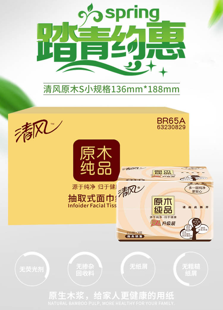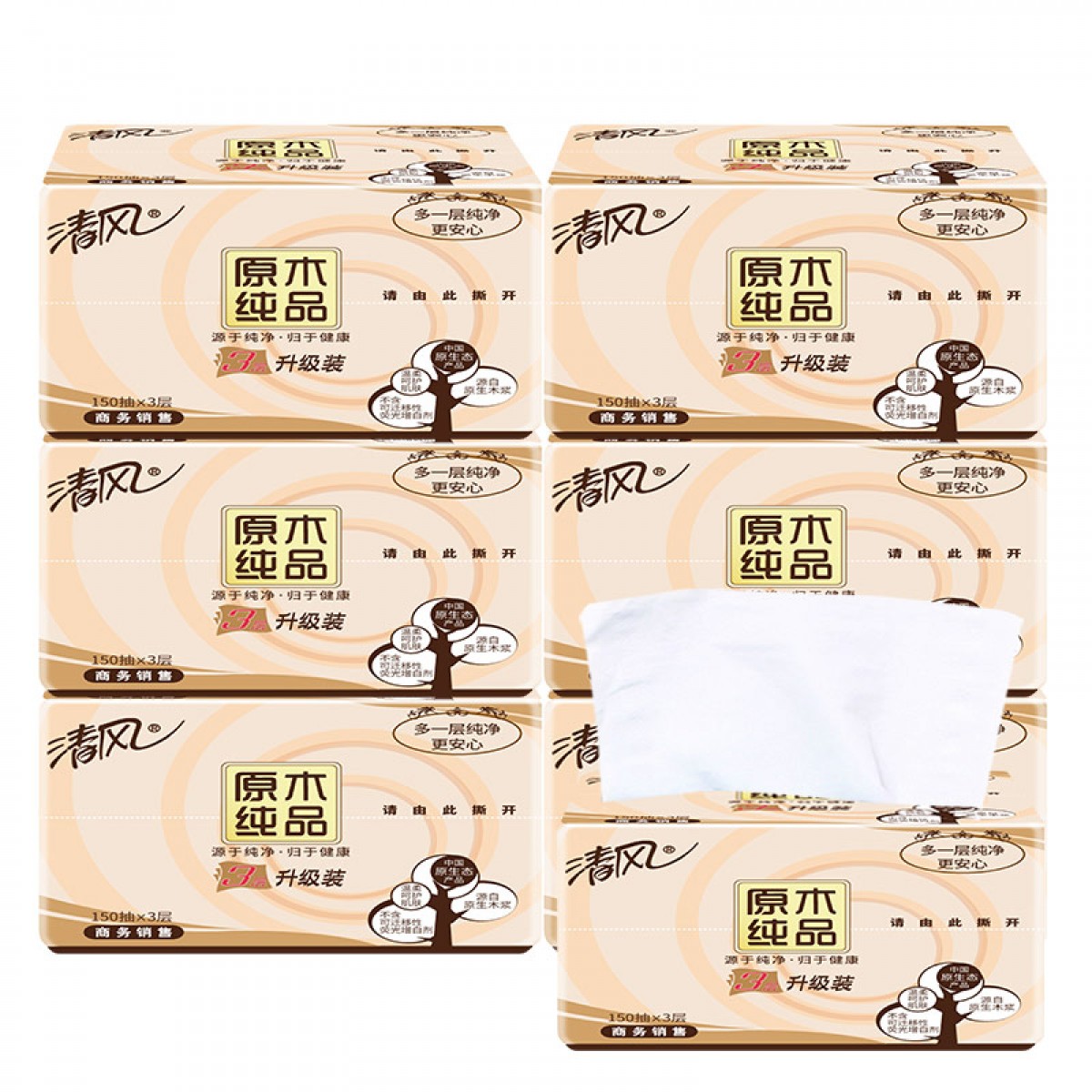 商品名称:清风 原木纯品抽纸批发纸巾三层抽取式150抽餐巾纸6包家庭装 BR65A