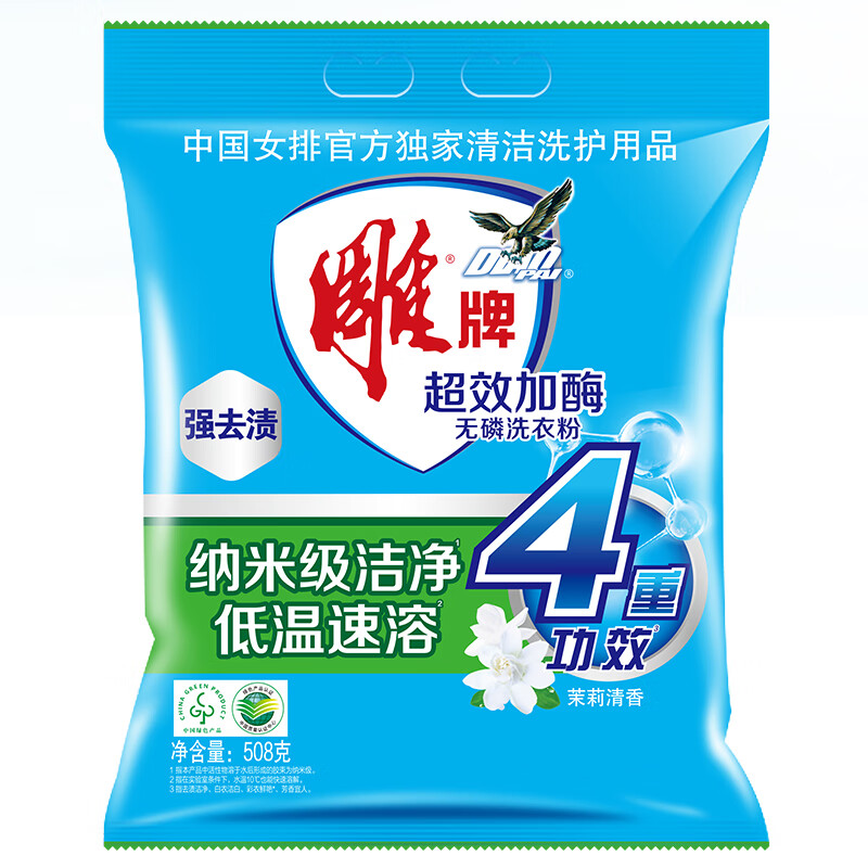 商品名称:雕牌 洗衣粉家用超效加酶茉莉清香强效去渍去污超效加酶无磷508g 单位:包