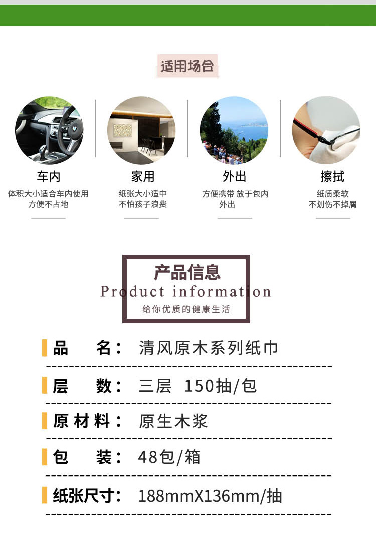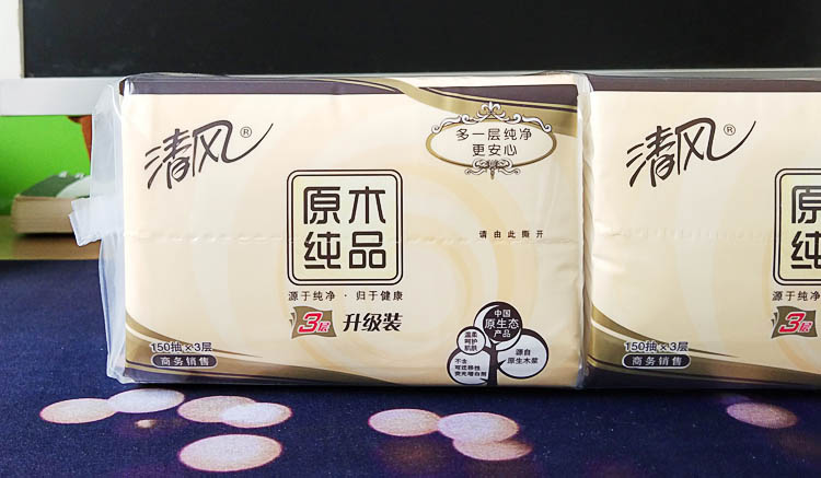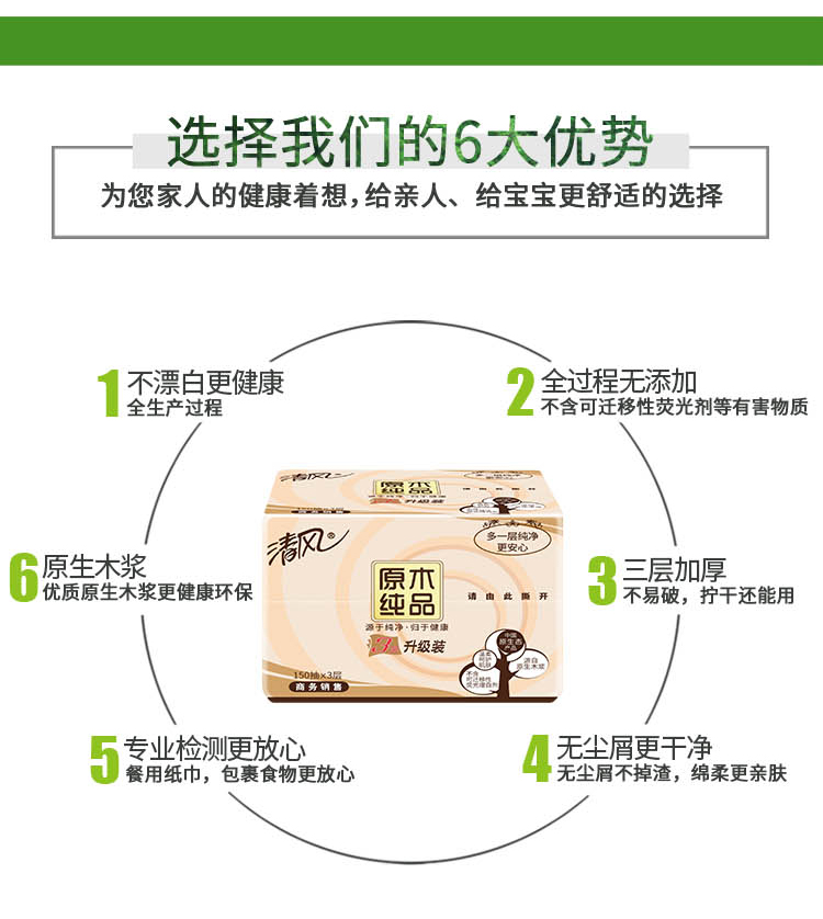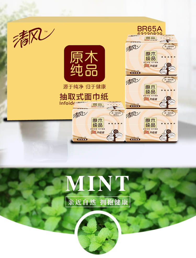 商品名称:清风 原木纯品抽纸批发纸巾三层150抽餐巾纸整箱48包家庭装 BR65A