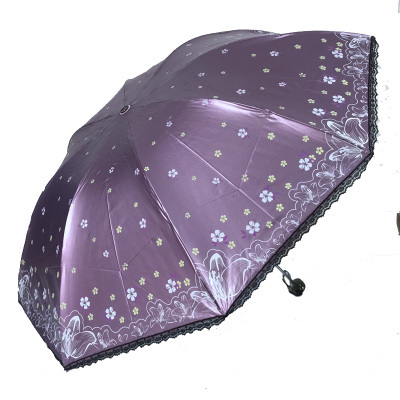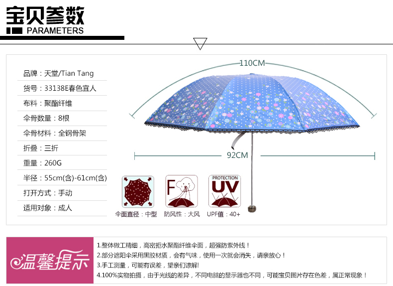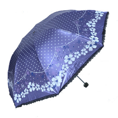商品名称:天堂伞 33138e春色宜人黑涤彩胶防晒伞三折叠晴雨伞遮阳伞蕾丝花边