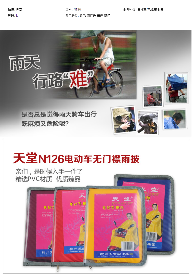 - 商品名称:天堂伞 电动车雨披/N126电/超柔软尼龙面料/不发硬防老化