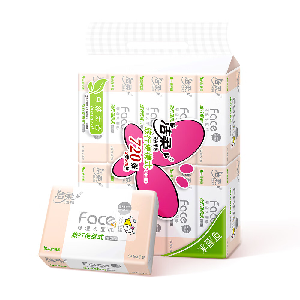 商品名称:洁柔 抽纸 粉Face3层24抽*10包 小方巾面巾纸 100%原生木浆手帕纸 单位:组