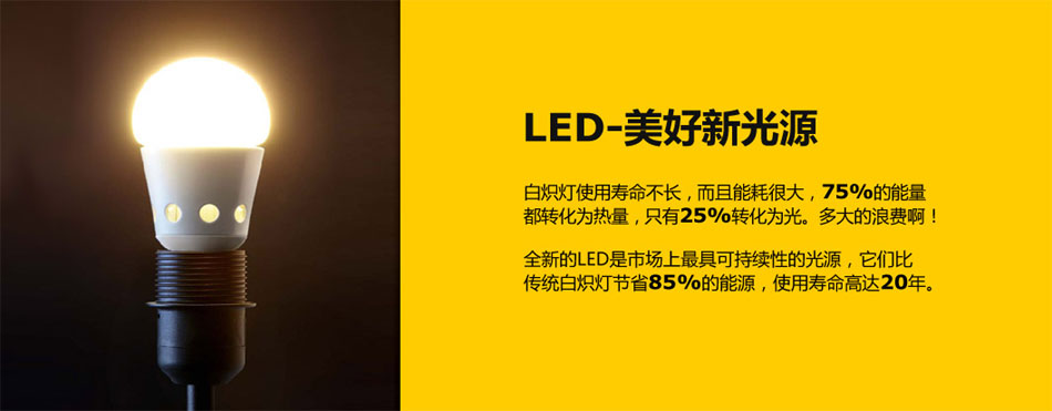 - 使用LED灯,省电85%,使用寿命比普通白炽灯长20倍。