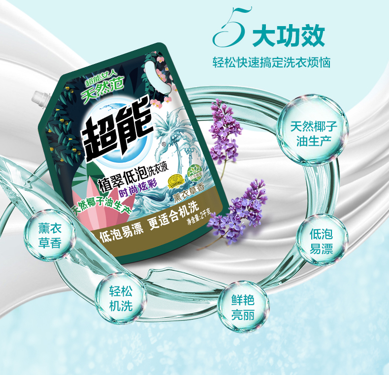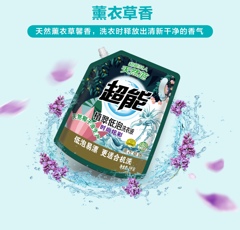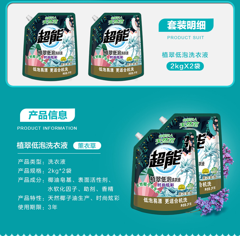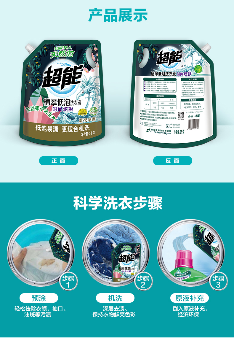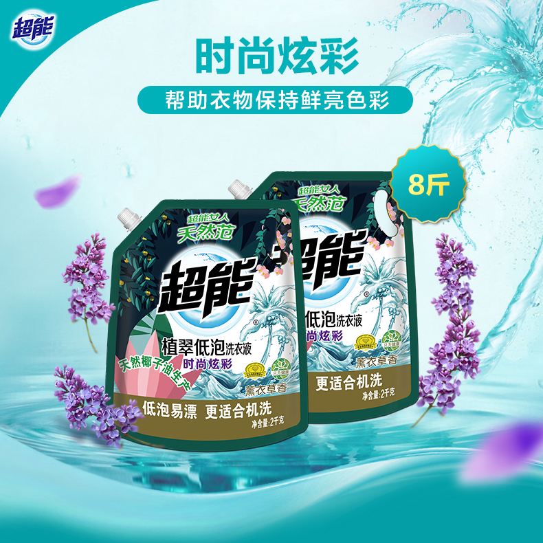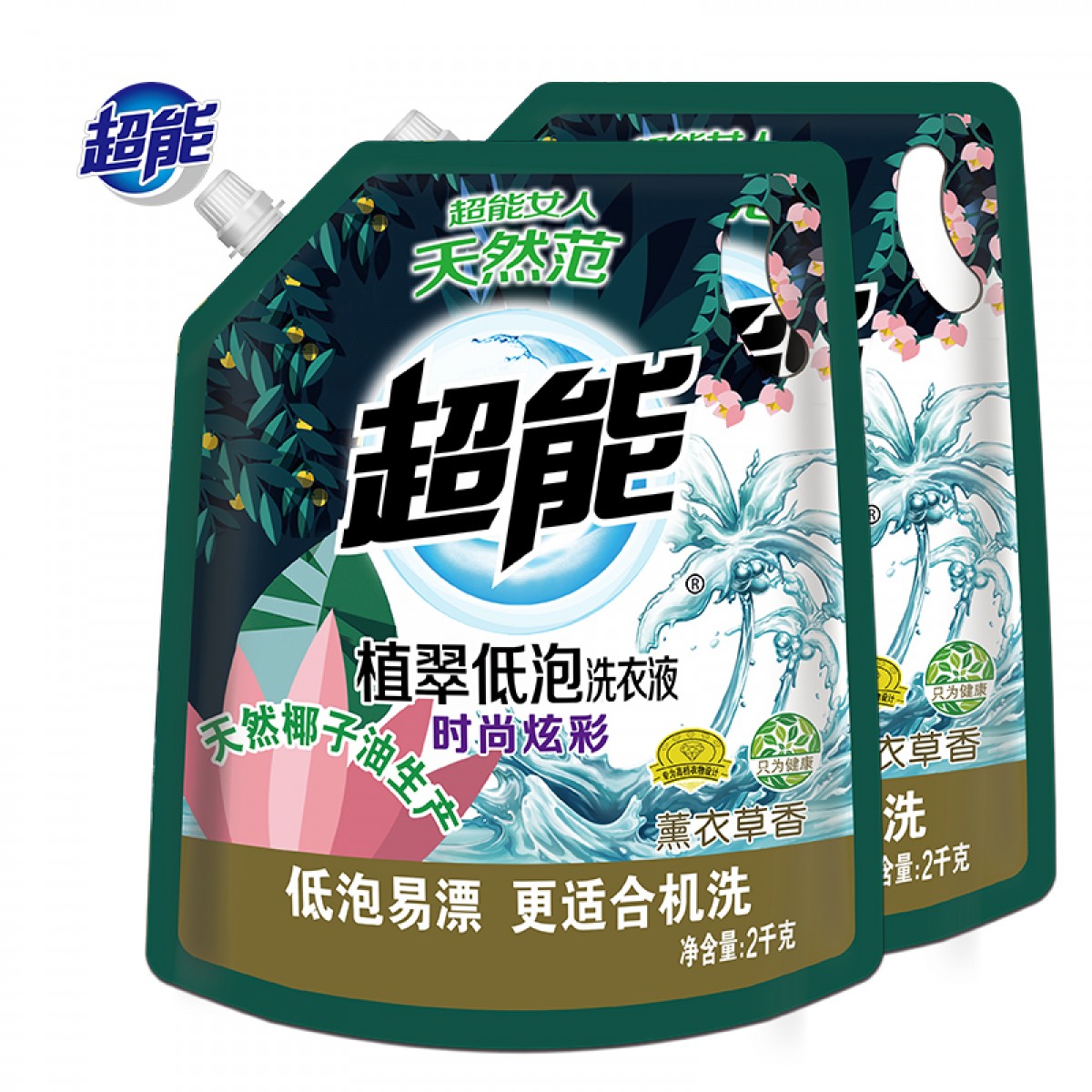 商品名称:超能植翠低泡洗衣液袋装2kg*2时尚炫彩袋家庭量贩装