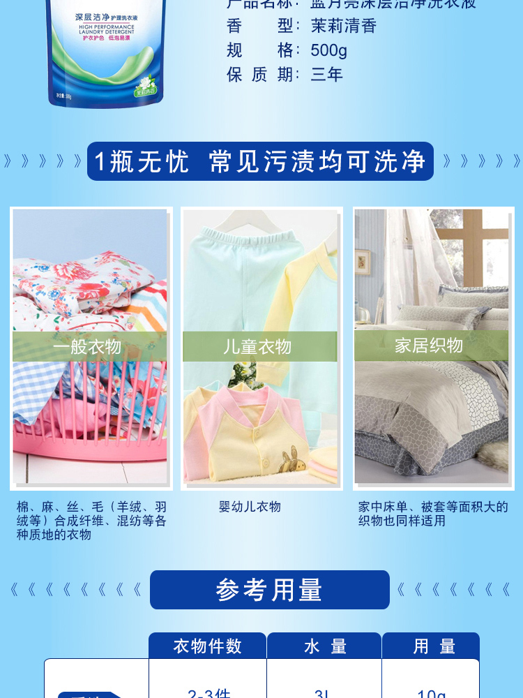 商品名称:蓝月亮500g袋装深层洁净洗衣液茉莉清香补充衣物护理手洗