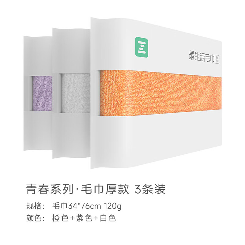 最生活 密封毛巾纯棉加厚3条装 新疆长绒棉A类毛巾柔软吸水洗脸巾 加厚款 青春毛巾-白/紫/橘 3条 单位:组
