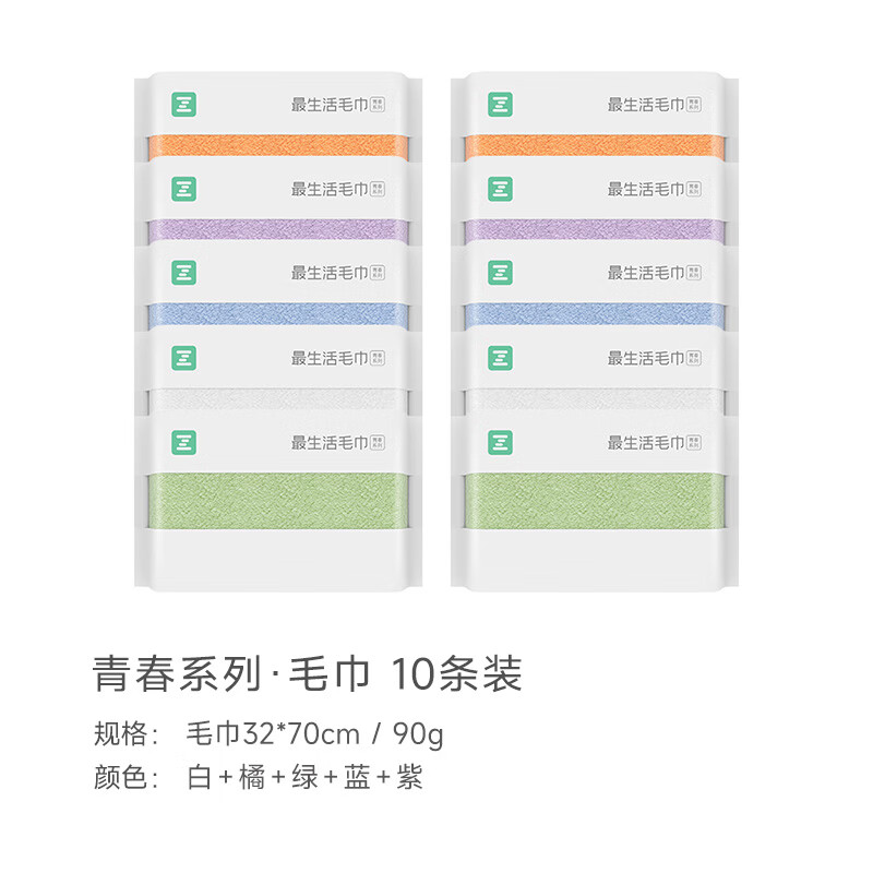 商品名称:最生活 密封毛巾纯棉轻柔10条装 新疆长绒棉A类洗澡毛巾男女吸水洗脸巾 轻柔款 青春毛巾 10条 单位:组