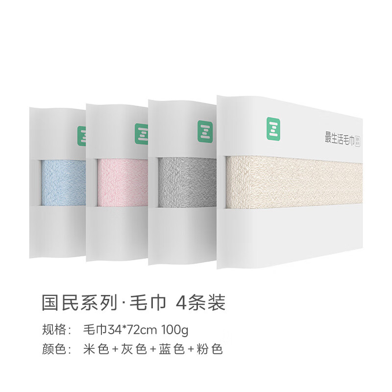 最生活新疆长绒棉毛巾4条装 A类纯棉家用毛巾男士 柔软吸水洗澡洗脸巾 长绒棉国民毛巾-灰米粉蓝 4条 单位:组