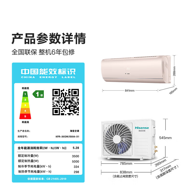 - 商品名称:海信(Hisense)KFR-35GW/S550-X1空调 大1.5匹 抑菌抗病毒 仿真自然风 单位:台(标准安装)