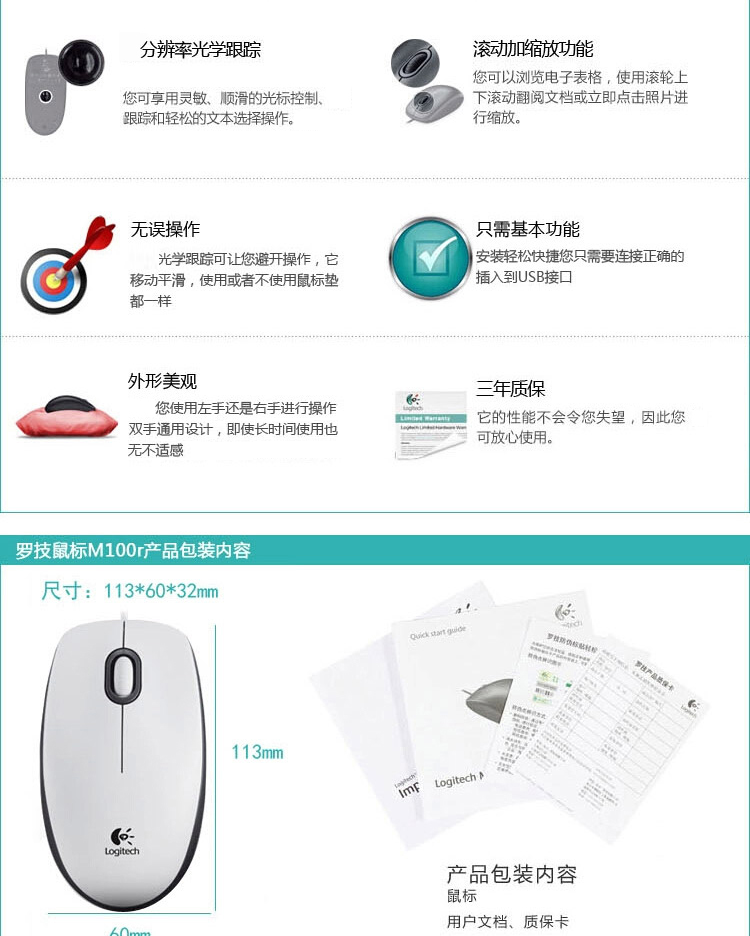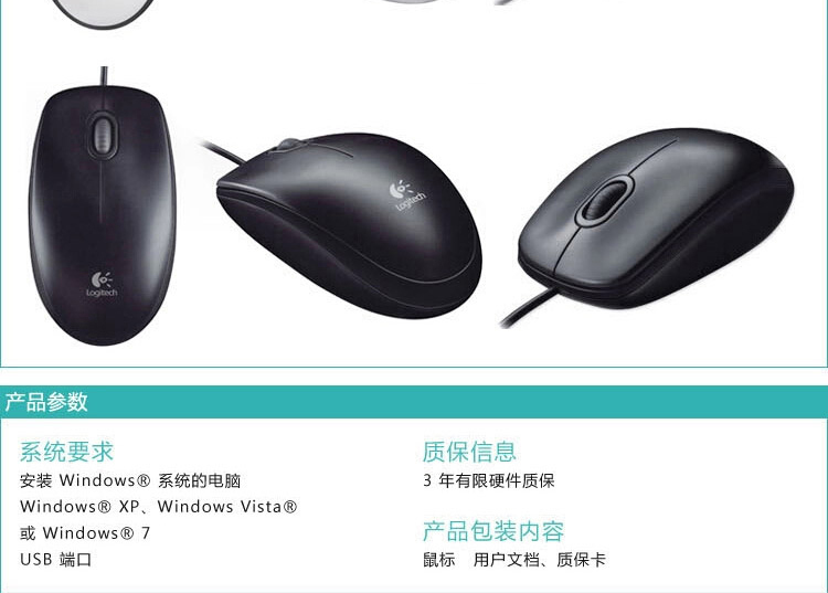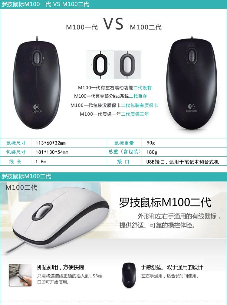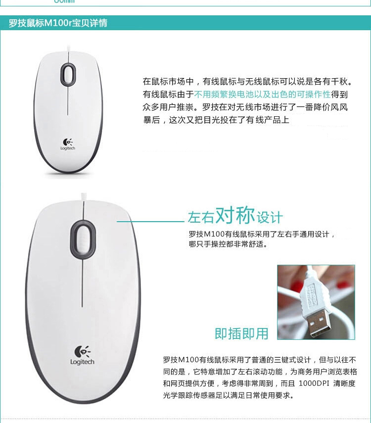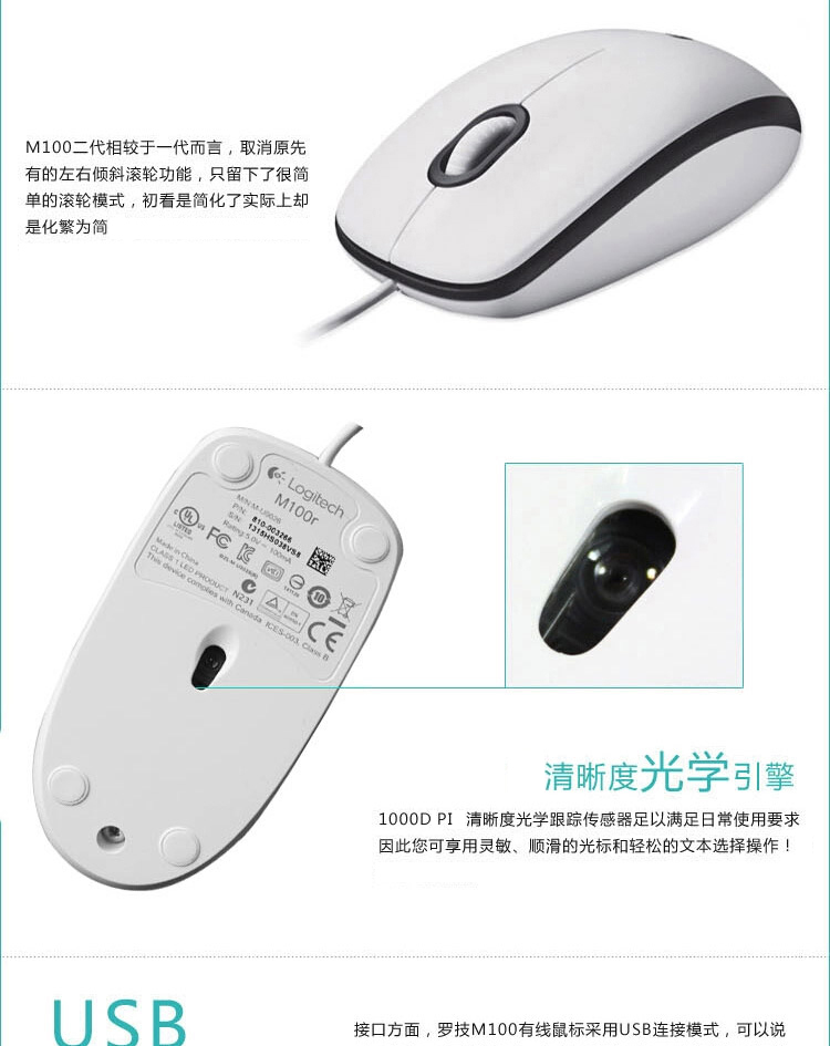 商品名称:罗技/Logitech 二代USB有线鼠标台式笔记本鼠标 M100R