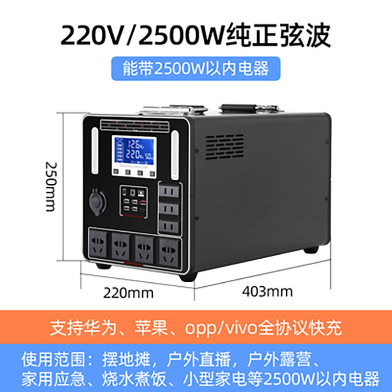 商品名称:赛利博 户外移动电源220V便携大容量 2500W【宁德电芯】250W毫安型(3.4度电)单位:个