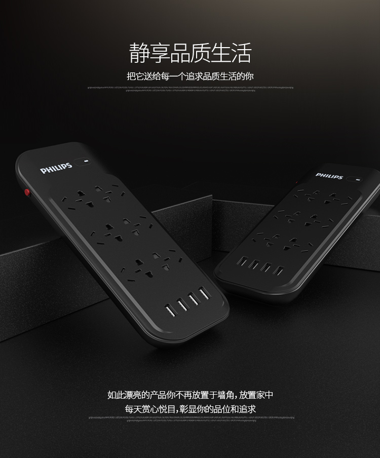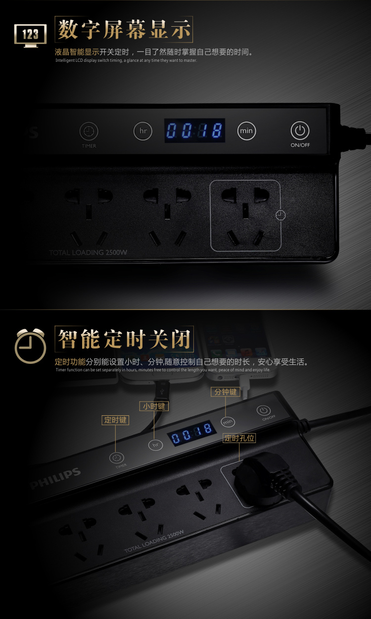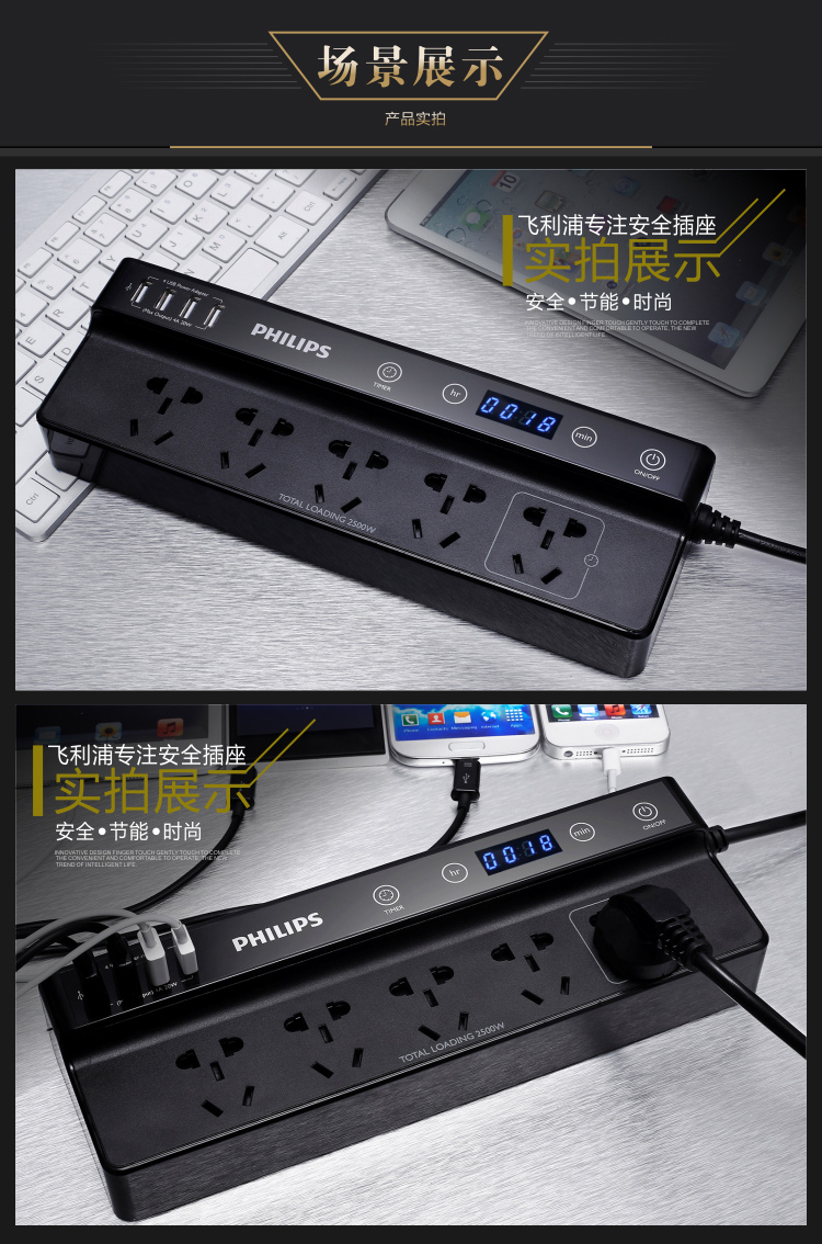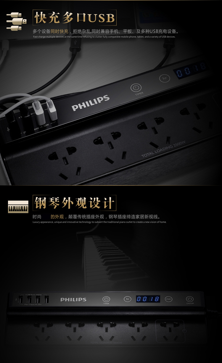 商品名称:飞利浦 PHILIPS接线板5位组合孔+4A快充4口USB智能定时插座 7530A