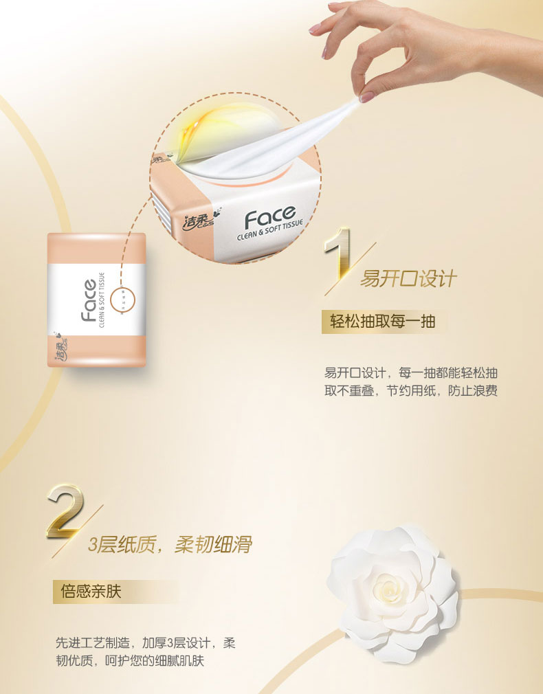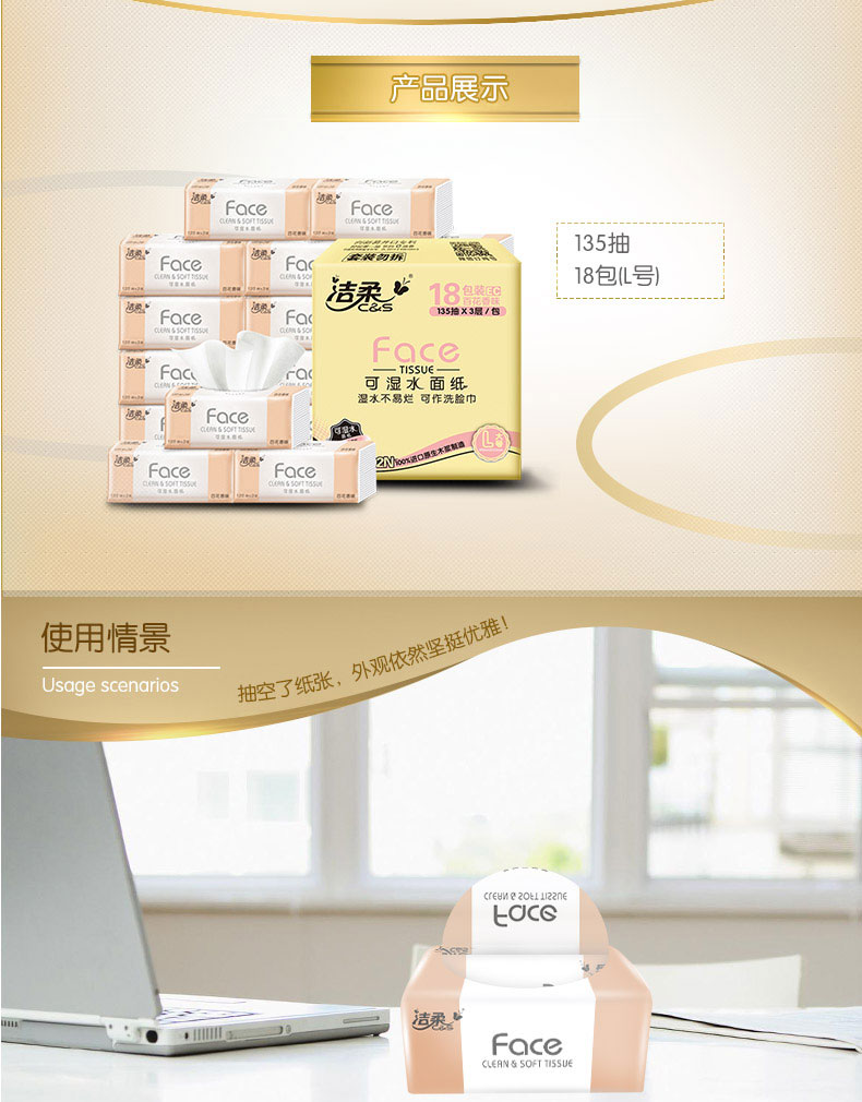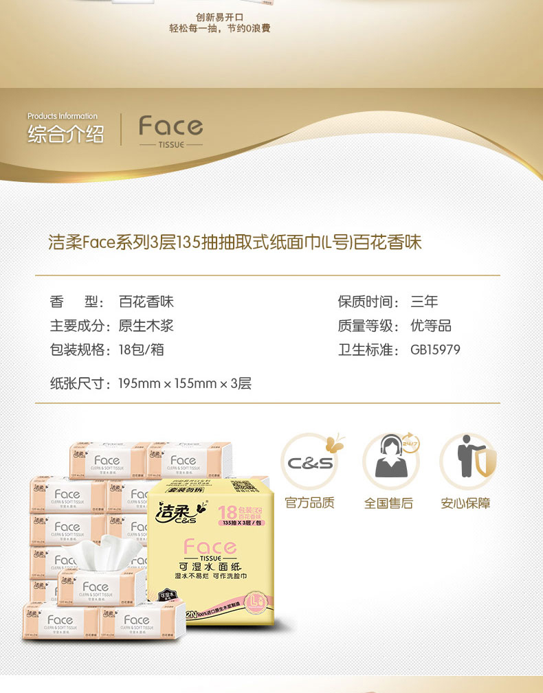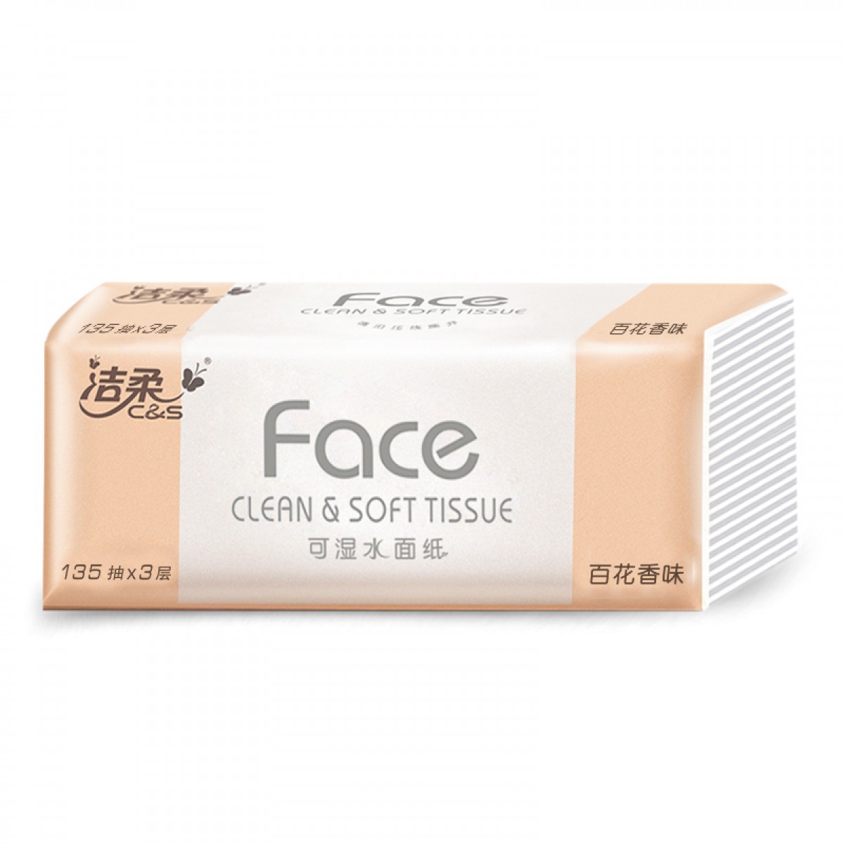 商品名称:洁柔 3层135抽整箱18包抽纸巾 粉face可湿水面纸百花香味餐巾纸