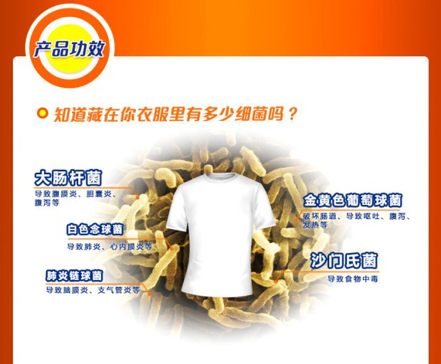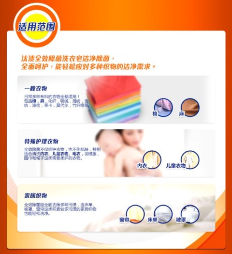汰渍全效除菌(舒肤佳)无磷洗衣皂126克 产品功效: 加入舒肤佳成分配方,不仅能有效去除看得见的污渍,更能强力去除衣物上的细菌,令衣物真正干净,带给家人温馨呵护。 注意事项: 1. 适用于棉、麻、化纤及混纺等质料的衣物,请勿用于洗涤丝质或毛料衣物,更多信息请参考衣物上的洗涤标示; 2. 适用于各色衣物,请将易褪色衣物分开洗涤; 3. 请将本品存放在阴凉、干燥及小孩接触不到的地方; 4. 若不慎入口或入眼,请立即用大量清水冲洗并及时就诊。 产品功效/功能 Product Functionality