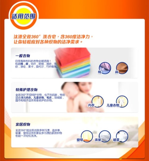 汰渍全效360度三重功效柠檬洗衣皂 注意事项 1、适用于各种衣物 2、请将本品存放于阴凉、干燥及小孩接触不到的地方 3、若不慎入口或入眼,请立即用大量清水冲洗并及时就诊 产品特色 Selling Point