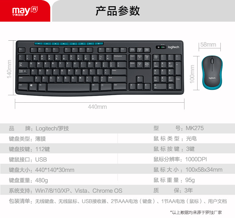 商品名称:罗技/Logitech 无线键鼠套装电脑笔记本键盘鼠标 MK275