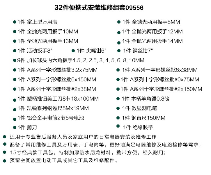 商品名称:SATA/世达 32件组合电工便携式安装多功能维修组套工具包套装 09556