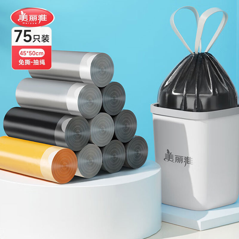 商品名称:美丽雅(MARYYA)抽绳垃圾袋 家用厨房垃圾袋 加厚塑料穿绳垃圾袋 45*50cm【75只装】 单位:组
