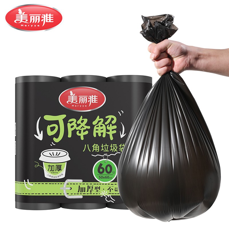 商品名称:美丽雅可降解垃圾袋加厚家用黑色一次性抽绳清洁纸篓塑料袋 平口款50x60cm【厚1.5丝60只】 单位:组