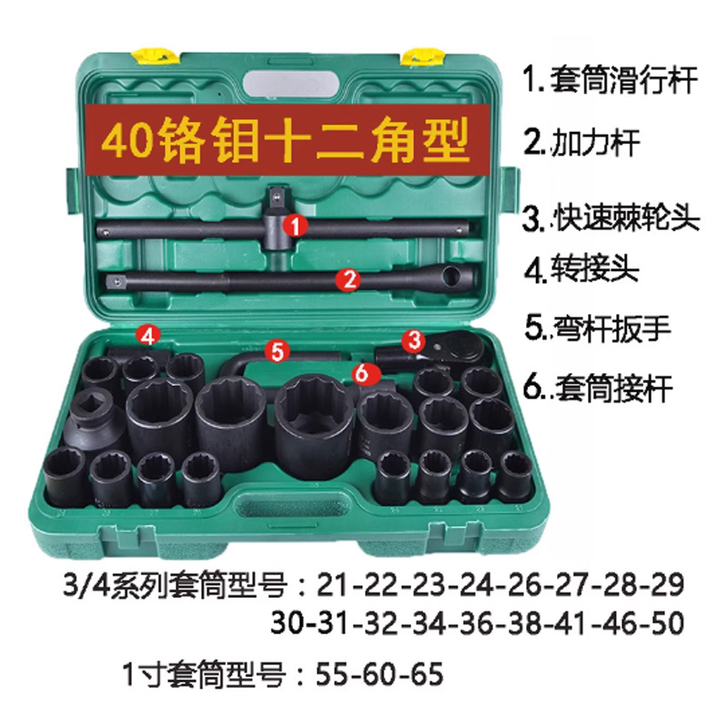 商品名称:邦耀 大风炮套筒组合套装1/2加长重型一寸气动3/4电动扳手套筒 26件套(40铬钼十二角梅花型) 单位:套