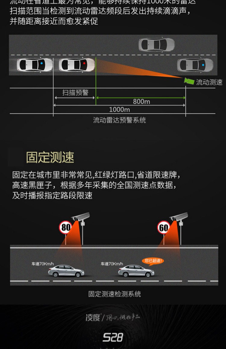 商品名称:凌度 S28行车记录仪双镜头高清夜视流动固定测速电子狗一体