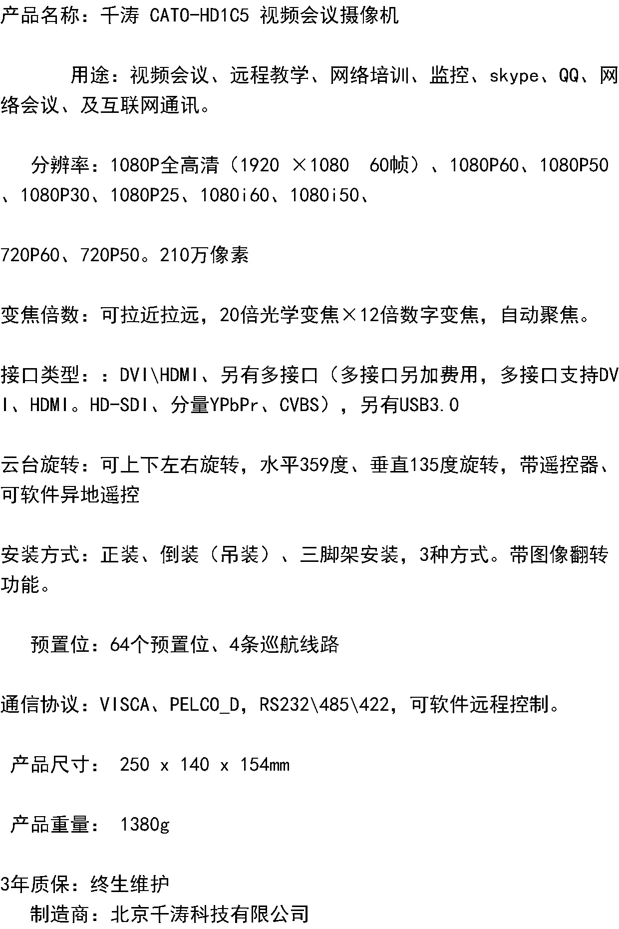 商品名称:千涛 视频会议高清摄像机1080P高清20倍光学变焦 可倒装 遥控旋转