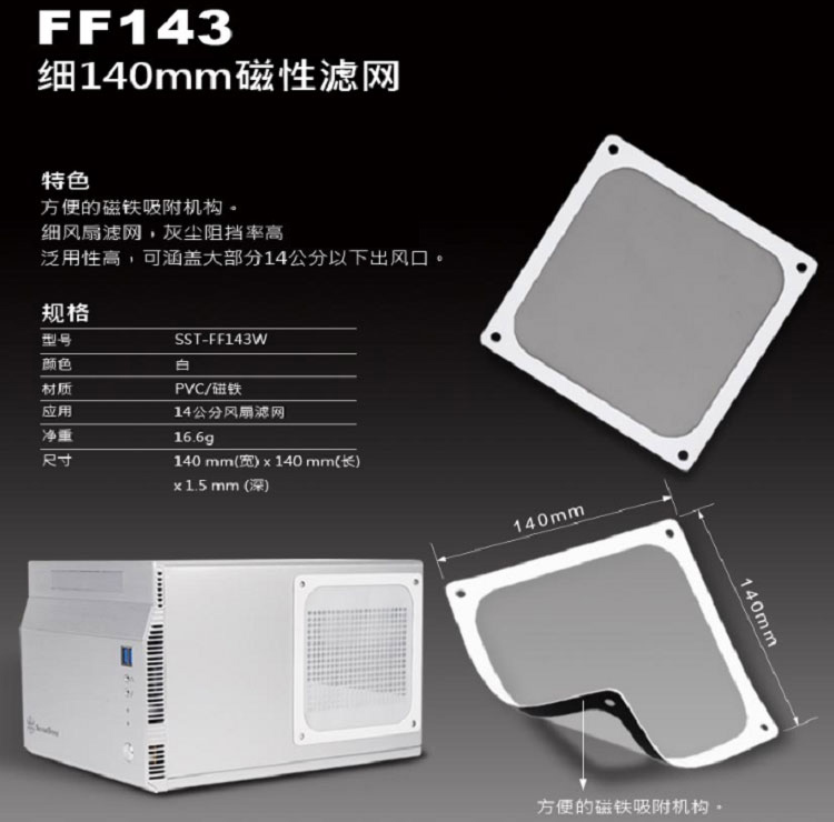 FF143磁鐵吸附。不需任何工具安裝便能吸附於鐵製機殼任何位置,14公分大口徑也能向下相容12公分風扇出風口,而惱人的灰塵被隔絕於護網之外,保持機殼內部潔淨能有效延長零組件壽命。